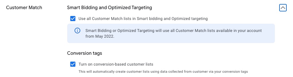 Wanneer je bij Customer Match het eerst vinkje aangezet, dan sta je Google toe om jouw first-party data als input te geven voor het optimaliseren van jouw campagnes. Super handig!