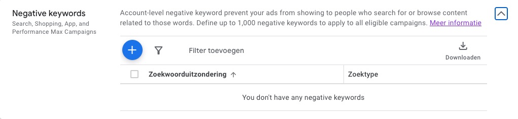Stel je hebt een zoekwoord waarvan je wilt dat er nooit een advertentie van jou wordt getoond, dan kun je dit zoekwoord op accountniveau uitsluiten. Je hoeft dit dus niet meer te doen per campagne maar heel makkelijk op account niveau.