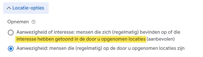 Waar terug te vinden in Google Ads? Bij Campagne instellingen > Locaties > Locatie-opties