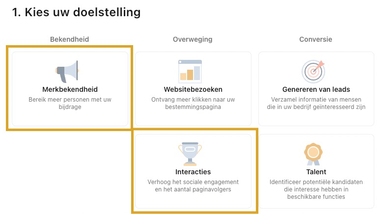 1 Zet een nieuwe campagne op en kies als doel Merkbekendheid of Interacties.