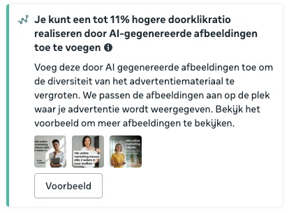 Meta genereert zelf creatieve varianten: andere kleuren, croppings, teksten, vormen.Handig, maar niet altijd effectief. Regelmatig worden visuals te generiek en blijf je niet dicht bij je merk.