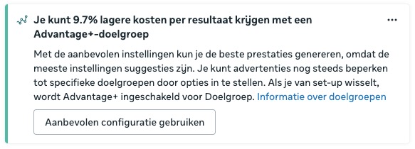 Bij veel klanten schuift Meta steeds sneller richting ‘Breed’, zelfs wanneer we starten met een specifieke doelgroep of kwalitatieve remarketinglijst. We zien ook dat Advantage+ soms niet de beste prestaties levert, maar desondanks een groot deel van het budget opeist.